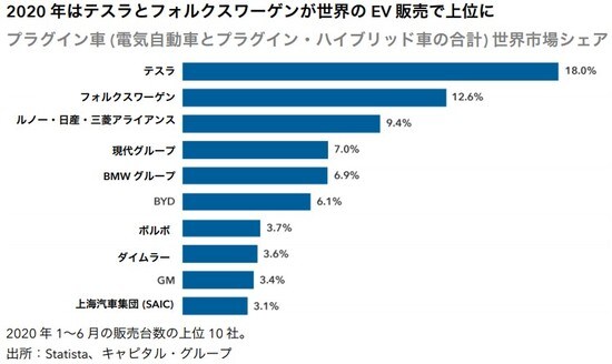 2020年のEVセクターをけん引したのは、電池技術と車載ソフトウェアのパイオニアであるテスラでした。先頭集団には同社のほか、EV生産に巨額を投じているフォルクスワーゲンや、中国のBYD(比亜迪)なども含まれていました。今後、大手自動車メーカーであれスタートアップ企業であれ、構造的な変化を素早く受け入れ、迅速に適応できる企業が長期的に成功を収める可能性を秘めています。