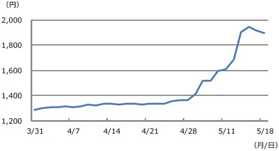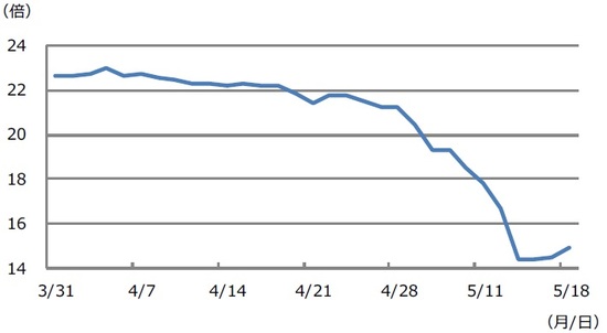 日経平均株価のEPSとPERについて、3月31日から5月18日までの推移を示したものが図表1と図表2です。ここで、図表1のEPSの動きに注目してみると、足元で水準が大幅に切り上がっていることが分かります。これは、直近の決算発表を経て、EPSが今期の1株あたり利益について、20%程度の増益を織り込んだことによるものと推測されます。これ自体、株価にとっては好材料です。