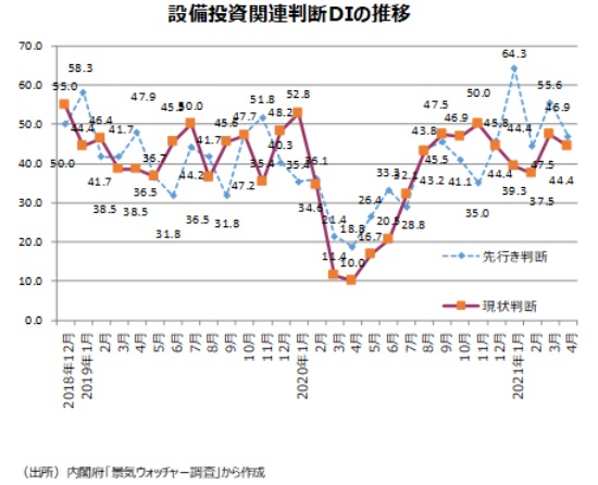 ●景気ウォッチャー調査の設備投資関連・DIの20~21年の動きをみる。20年1月の現状判断DIが52.8(回答数9人)と18年12月分の55.0以来の50超であった。当時の設備投資関連・現状判断DIからは底堅さが感じ取れるようになっていた。しかし、新型コロナウイルスの影響で現状判断DIは4月10.0(同5人)へと急落した。4月を底にその後、緊急事態宣言解除もあり、多少の上下はあったものの11月は50.0(同13人)まで持ち直した。しかし、その後は新型コロナウイルス感染再拡大の中、12月は44.4(同9人)、21年1月は39.3(同7人)、2月は37.5(同14人)と低下したあと、3月は47.5(同10人)に戻り、4月は44.4(同9人)になっている。4月のコメントには「客の設備投資意欲が増しており、案件の引き合い数は確実に増加傾向にある。(九州・金属製品製造業〔事業統括〕)」というコメントがあった。