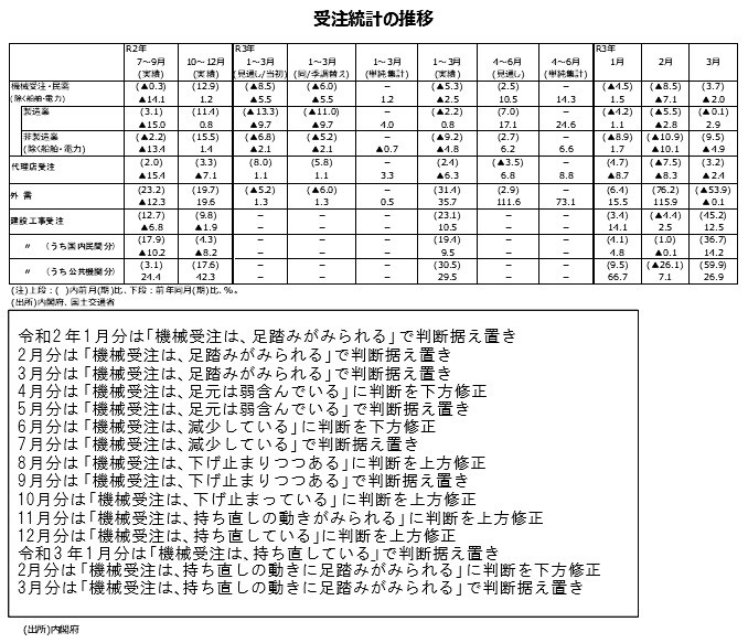 ●内閣府の基調判断の推移をみると、19年10月分から20年3月分まで半年にわたり「機械受注は、足踏みがみられる」という判断であったが、新型コロナウイルス感染拡大の影響が大きく出た4月分では「機械受注は、足元は弱含んでいる」という判断に下方修正され、5月分では判断据え置きになった。6月分では「機械受注は、減少している」という判断にさらに下方修正され、7月分では判断据え置きになった。8月分で「機械受注は、下げ止まりつつある」に上方修正され、9月分でも据え置きになった。10月分で「下げ止まっている」に上方修正となったあと、11月分で「持ち直しの動きがみられる」に上方修正、12月分では「持ち直している」に3ヵ月連続で上方修正となった。21年1月分では「持ち直している」で判断据え置きになった。前回2月分では「持ち直しの動きに足踏みがみられる」に判断が下方修正され、今回3月分でも「持ち直しの動きに足踏みがみられる」と据え置かれた。機械受注(除船電民需)の3ヵ月移動平均が2ヵ月連続減少になったことなどを反映しているようだ。