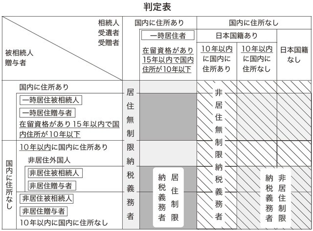 複雑な表ですが、それだけ規定が複雑ということです。見方は、まず、縦に相続人の項目を当てはめ、次に、横に被相続人の項目を当てはめていくことになります。交わったところが判定結果です。その結果、呼称は別として、無制限納税義務者となればすべての財産が課税対象となり、制限納税義務者となれば日本国内の財産だけが課税対象となります。