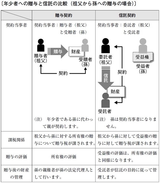A. 生まれて間もない子供に対してでも財産を贈与することはできます。また、信託の受益者を孫にすることで、実質的に財産を贈与したのと同様の効果を得られます。なお、贈与の場合には、契約当事者は贈与者と受贈者になりますが、信託の場合は、委託者と受託者であり、受益者は契約当事者になりません。