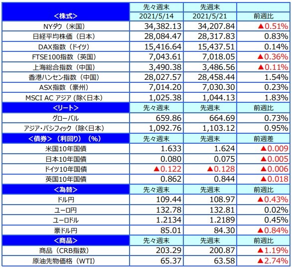 主要株式市場はまちまちの動きとなりました。米国株式市場は、高値警戒感から主力ハイテク株などに利益確定売りが出たほか、環境問題への意識や中国の規制強化の報道などを背景にビットコインが急落したことが投資家心理を冷やしました。週間ではNYダウは0.51%下落しました。日本株式市場は、日経平均株価は前半はかなり不安定な動きとなりました。その後も方向感は定まらない動きとなりましたが、28,000円を下回るところでは買いが入り、下値の堅さが確認されるかたちとなりました。週間では0.83%上昇しました。欧州株式市場は、コロナワクチン接種が進み景気回復期待などから独DAX指数は0.14%上昇しました。英FTSE100指数は原油価格下落などを受けて、0.36%下落しました。中国株式市場は、香港ハンセン指数は証券相互取引を通じた中国本土資金の流入観測を背景に、投資家が運用リスクをとる姿勢を強め、1.54%上昇しました。上海総合指数は0.11%と小幅に下落しました。