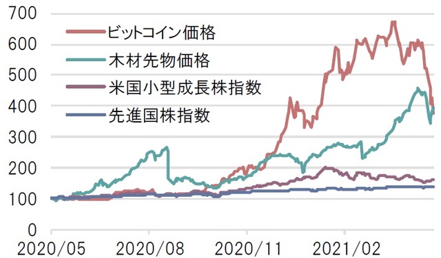 もちろん急落した金融資産にはそれぞれ固有の要因がある。例えば、暗号資産(仮想通貨)のビットコインであれば、電気自動車大手テスラの創業者であるイーロン・マスク氏が、(今年3月にビットコインでテスラ車を購入可能と発表したにもかかわらず)ビットコインでのテスラ車購入の受付停止を発表したことや、中国当局が暗号資産の規制強化に動いたことなどが挙げられる。