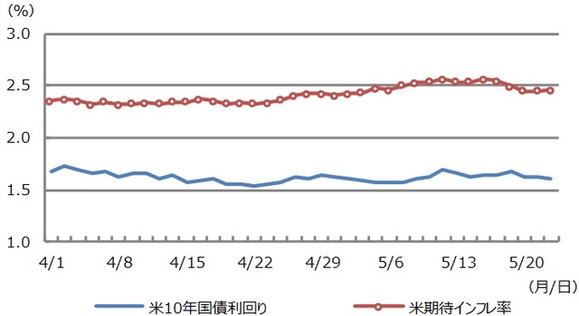 5月第2週は、4月の米消費者物価指数(CPI)が市場予想を大幅に上回ったことから、米国のインフレ加速に対する警戒が強まり、各国の主要株価指数は大きく下落しました。しかしながら、米長期金利については、期待インフレ率にいくらか上昇の動きがみられたものの、それが10年国債利回りを大幅に押し上げることもなく(図表2)、また、ドル円でのドル高の動きも限定的だったため、株式市場はやや過剰反応という印象を受けます。