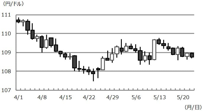 ドル円は、4月の新年度入り直後、1ドル=110円台後半で推移していましたが、徐々にドル安・円高が進行し、4月23日には一時107円40銭台をつけました。その後はいったんドル高・円安方向に転じたものの、5月は109円台後半で押し戻される場面が目立ち、110円台の回復には至っていません。このように、新年度入り後のドル円は方向感に乏しく、直近までの値幅は3円30銭程度です(図表1)。