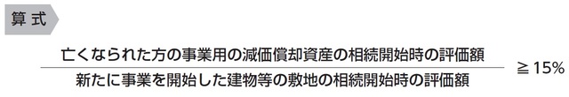 なお、亡くなる前3年以内に新たに事業を開始した建物等の敷地は、建物等の評価額がその敷地等の評価額の15%未満の場合は、特例の適用ができません。