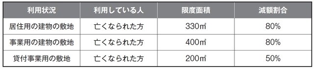相続税の計算上、敷地や借地権の評価額から減額できる面積の上限や減額割合は、下記のとおりです。