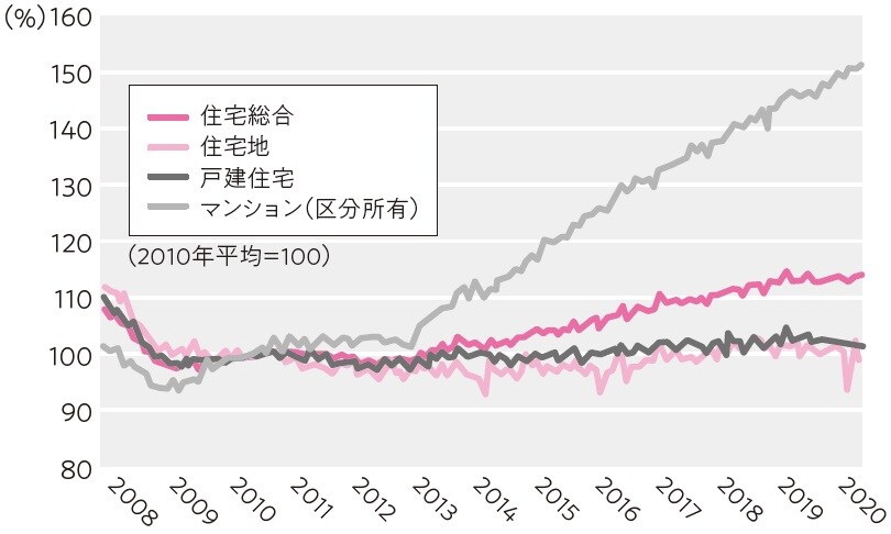 日本での不動産投資は未経験ですが、ここ1、2年はデータを見ています。国土交通省の不動産価格指数を見ると、2010年を100としてどれくらい上がっているかがわかります(図表8)。