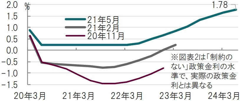 もっとも、1-3月期のGDP成長率予想を下方修正するなどハト派(金融緩和を選好)的な面も見られます。ただ、成長見通しを引き下げた背景は新型コロナウイルスの影響で観光産業などの戻りが鈍かった点などが要因と指摘しています。従って当面景気動向には警戒姿勢ながら、世界的にワクチン接種が進めば景気回復するとの期待が声明に示されています。次の政策金利の想定はよりタカ派です。