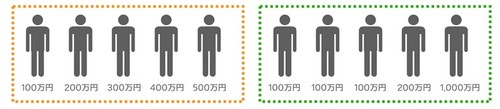下の図は、共に平均年収300万円の集団ですが、内容が全く異なります。単純に平均年収が上がったという結果を見るだけでなく、中身を見てどのような構成になっているのかを把握したほうが、正しい理解ができます。