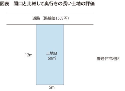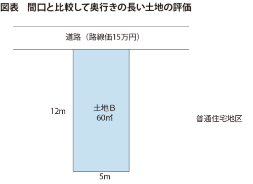 普通住宅地区の場合、間口よりも奥行きのほうが2倍以上長いと減額が認められています。下図の土地の場合、間口が5メートルで奥行きが12メートルですから、間口に対する奥行きは2・4倍となります。