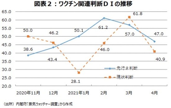 4月「ワクチン」先行き判断DIは50割れ。期待が47「ワクチン」が接種進捗の遅れなどを反映か