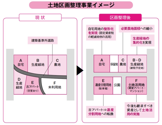 土地区画整理事業とは、道路・緑地・ゴミ置場等の公共施設を整備・改善し、土地の区画を整え宅地の利用の増進を図る事業をいいます。土地区画整理事業であれば、生産緑地を解除せずに道路等を整備して、相続財産の価値を上げることが可能となります。