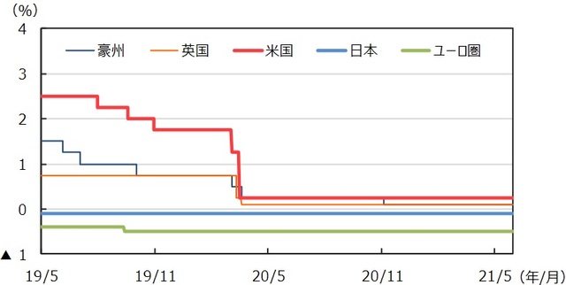 主要中央銀行は金融政策を「緊急緩和」から「緩和的金融環境を維持」の状態にシフトしており、主要先進国の政策金利は相当期間、現状維持が続くとみられます。FRBは2022年初以降、債券購入ペースの減額(テーパリング)を開始する可能性がありますが、雇用回復や金融市場安定のため市場とのきめ細かいコミュニケーションを通じて、金利の急上昇を回避するようにかじ取りを行う見通しです。ECBは次回6月の理事会で新しい経済・物価見通しを示し、資産買い入れのペースなどを議論しますが、今後も緩和的な金融環境維持に向けた政策運営を続ける見通しです。日銀は金融緩和の持続性を高めるため政策の微修正を行っており、現行の大規模金融緩和を長期化するとみられます。