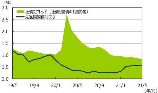 主要先進国の10年国債利回り(長期金利)はまちまちの動きとなりました。米国では、中旬に4月の消費者物価が予想を上回る伸びとなったことでインフレ加速を警戒する売りが強まり、一時1.7%程度に上昇しましたが、FRB理事がインフレ上昇は一時的との見方を示したことなどから債券に買いが入り、月間では長期金利が低下しました。欧州では、ワクチン接種の進展を受けた景気回復期待などから長期金利が小幅に上昇しました。日本では、3回目となる緊急事態宣言がさらに延長される中、長期金利はわずかながら低下しました。社債については、景気回復期待から国債と社債の利回り格差がやや縮小しました。