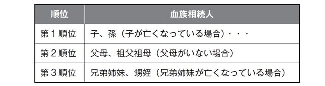 法定相続人とは、被相続人から財産を引き継ぐ権利のある人をいい、民法で定められています。配偶者は常に相続人となりますが、血族相続人は、下記のように順位が定められています。