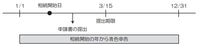 相続人が以前より事業を営んでいた場合は、上記①と同様に相続開始の年の3月15日までに青色申告承認申請書を提出すれば、その年から青色申告を適用できます。