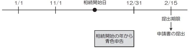 相続人が以前より事業を営んでいなかった場合は、相続開始の日(事業開始の日)から2ヵ月以内に青色申告承認申請書を提出すれば、その年から青色申告を適用できます。