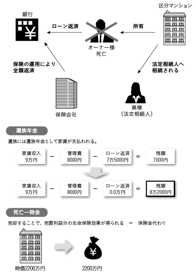 ローン返済中は、家賃収入の大半をローン返済に回すことになりますが、ローンがなくなれば、遺族の元には家賃収入の全額が入ってきます。あるいは、物件を売って、まとまったお金を確保することも可能です。