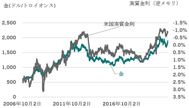 *実質金利:米インフレ連動10年国債利回り、金/ドル:スポット価格