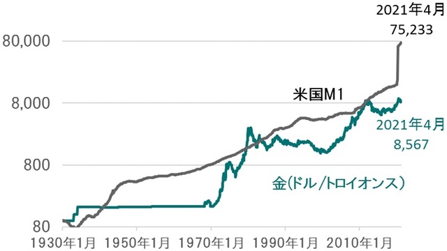 米国が金本位制を離脱し自由に通貨供給を行えるようになったニクソンショック(1971年8月15日)を起点に米ドルの通貨供給量(M1)の伸びを算出するとリーマンショック(2008年9月15日)までは年率約5.2%であったがコロナショック後の2021年4月末現在では同9.3%の伸びと急上昇している。仮に金の期待される年間の供給量が2%とするとその差異7.3%が金の上昇要因となる。あるいは米ドルの通貨価値を維持するには米国国債の利回りが7.3%必要になることを意味すると考えることもできる。