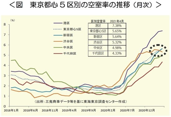 2021年5月13日に三鬼商事が東京都心5区(千代田・中央・港・新宿・渋谷区)の2021年4月時点のオフィスビル平均空室率を発表した。