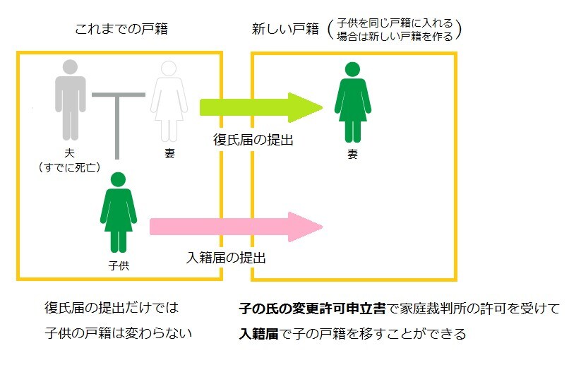 復氏届で姓と戸籍が変わるのは届け出た妻本人だけです。亡くなった夫との間に子供がいる場合は、子供は夫の戸籍に残ったままになり、母親と子供で戸籍と姓が異なる状態になります。