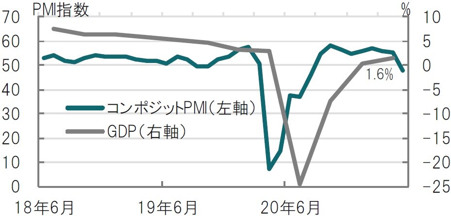 しかし、1-3月期の回復は今年4月のインド型変異ウイルスへの感染急拡大前の数字です。気になるのは、感染拡大の影響です。ひとつの目安として、GDPの動向に先行する傾向が見られる総合購買担当者景気指数(PMI)を参照すると、直近の5月総合PMIは48.1と、4月の55.4から低下してはいますが、今のところPMIは昨年前半ほどの大幅な落ち込みは回避されています。