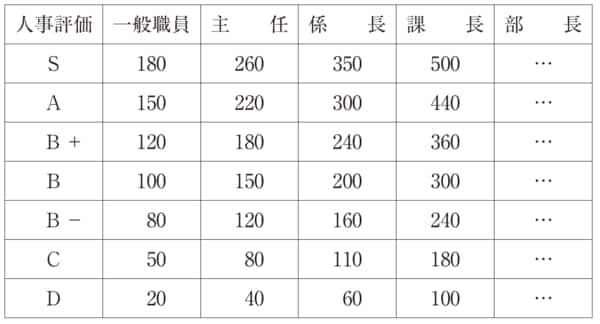 ※この方式は、図表のように人事評価結果(S~Dなど)による獲得ポイントを設定しておき、該当するポイントに単価(全職員一律)を掛けて賞与額を決めるしくみです。