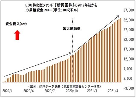 先進国の残高の伸びのペースをみると、ESGに力を入れる欧州は継続的に伸びているが、そのなかでも環境・クリーンエネルギーや多様性などを重視する米バイデン氏が2020年11月3日に実施された大統領選に勝利したことで米国のESG関連ファンドの残高の伸びが一段と加速(角度が切り上がる)していることが読み取れる(日本や新興国なども同様な動き)。