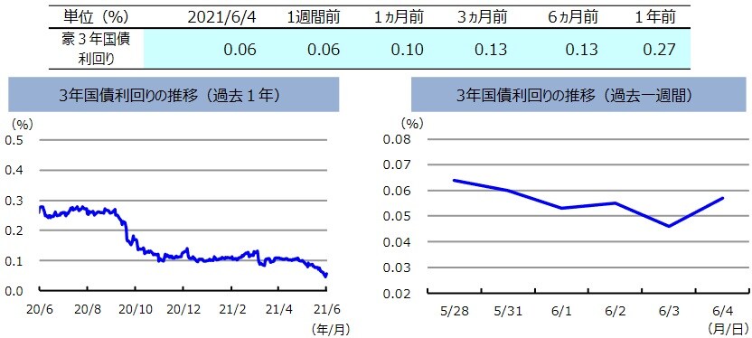 先週の豪州3年国債利回りは、わずかに低下しました。豪州の経済指標は堅調でしたが、豪州3年国債利回りは週間ではわずかに低下(国債価格は上昇)しました。豪州準備銀行(RBA)は、6月1日の金融政策決定会合で、市場予想通り金融政策を現状維持としました。