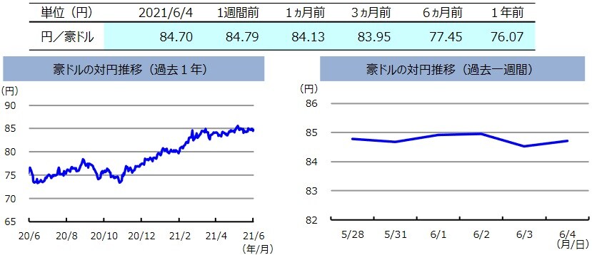 先週の豪ドルの対円レートは、若干下落しました。6月2日に発表された2021年1-3月期の実質GDP成長率が市場予想を上回ったため、豪ドルは堅調に推移しました。その後、3日に発表された米経済指標が市場予想を上回ったことで豪ドルは下落しました。円も対米ドルでは同様の動きとなりましたが、円が若干堅調さを維持したため、豪ドルは円に対して弱含みました。週間では豪ドルの対円レートは若干下落しました。