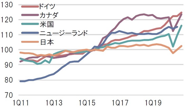 2021年1-3月期の主要国の住宅価格は大きく上昇した。前年同期との比較ではコロナショックによるベース効果があるとは言え、ニュージーランド(NZ)は前年同期比+22.4%、米国は同+10.3%、ドイツは同+9.6%、そして日本でも同+9.3%と大幅な伸び率となった。また、前期との比較でも、NZは前期比+10.0%、米国は同+2.4%、ドイツは同+2.1%、日本も同+1.9%となった(図表1)。