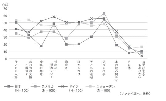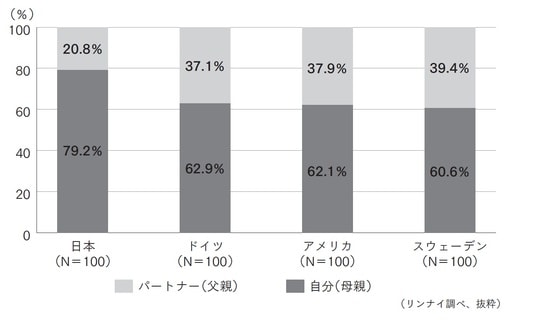この調査の対象となったアメリカ、ドイツ、スウェーデンでは女性が担う割合は6割程度という結果になっています。もちろん、日本でも育児に積極的に参加している男性もいます。しかし、国際的な比較をしてみると、日本ではまだまだ女性が育児の多くを担当しているということが分かります。