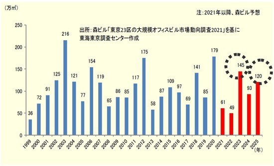 一方、2023年に高い供給量の山(145万㎡)が見られ、またその後の2025年にも120万㎡の供給があることがわかる(図2参照)。