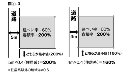 床面積が減るということは、アパートやマンションであれば部屋の間取りが小さくなったり、部屋数が減るという懸念もある。5メートルあれば200%(5×0.4×100)を確保できる。敷地面積が同じでも道幅の違いによって延床面積が変わる。