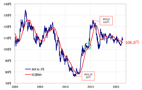 足元の米ドル/円の52週MAは106.3円程度なので、これまで見てきたことからすると、米ドル/円が上昇トレンド展開中なら、それと逆行する一時的な下落は106~107円程度までがせいぜいといった見通しになるでしょう。