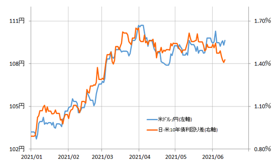 先週の米ドル/円は109円台での推移に終始しました。ただ、米ドル/円と相関性の高い日米金利差米ドル優位は大きく縮小しました。最近の米ドル/円と金利差の関係からすると、米ドル/円は108円近くまで下落してもおかしくなかったほどの金利差の動きでした(図表1参照)。