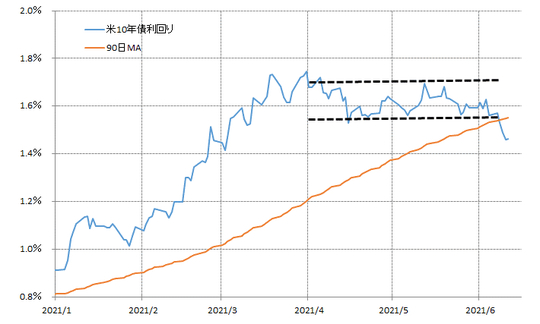 米10年債利回りは、4月初めに急騰が一段落すると、その後は1.55~1.7%といった狭いレンジ中心の方向感の乏しい展開が2ヵ月以上にわたって続きました。小動きが長く続くと、基本的に相場はエネルギーが溜まるため、レンジを抜けた方向に大きく動きやすくなります。スケールは異なるものの、今年1月末から米ドル/円が上昇急拡大に向かったことと、基本的には同じ考え方になります。