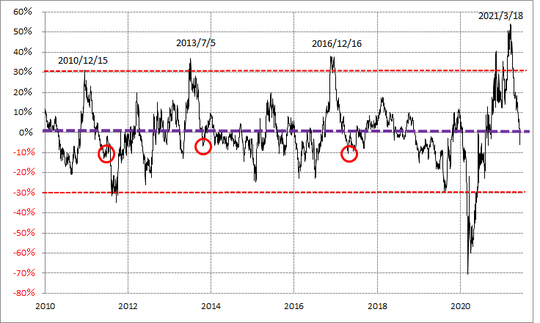 今回のように、米10年債利回りが90日MAを30%以上も上回るといった「大きな上がり過ぎ」の修正では、それに伴う金利低下は、一転して90日MAを10%程度下回るまで続くことが基本でした(図表5参照)。これを今回のケースに当てはめると、米10年利回り低下は1.4%前後で終わる=最終局面を迎えている、そんな見通しになります。