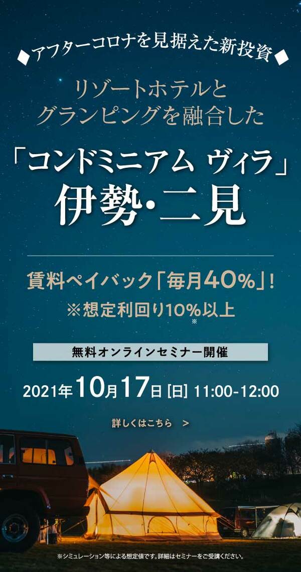 テンフィールズファクトリー株式会社が新たに販売を開始する、投資型宿泊施設「+FINO RESORT VILLA」(プラフィーノリゾートヴィラ)。手ぶらで訪れてもキャンプを楽しめる「グランピング」と、贅沢な「ホテル空間」を併せ持つ新しいタイプの宿泊施設で、建設地は三重県伊勢市。2階建て17室の区分所有物件(平均価格1室2,300万円程度を予定)は、2022年に竣工予定だ。