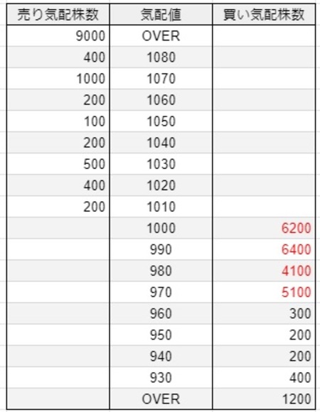 これは架空の会社の板ですが、970円から1000円の間で、他の価格帯とは桁違いの注文が入っています。図表ではそれを、赤字にしています。では、この板を見た投資家は、どう考えるでしょうか?