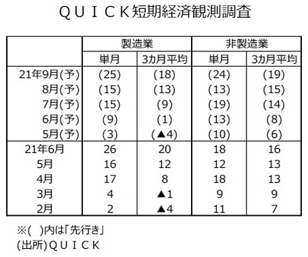 ●日銀短観の大企業9・業況判断DIの月までの「先行き見通し」は、QUICK短観やロイター短観などを参考にして、製造業では自動車産業での半導体不足の影響などを考慮し、6月実績比1ポイント悪化の+18程度、非製造業はワクチン接種加速のプラス面の影響期待で6月実績比8ポイントの改善の+12程度と予測した。