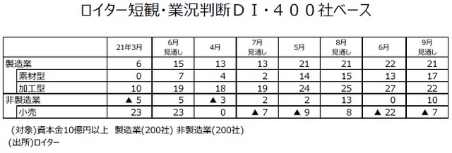●一方、ロイター短観6月調査400社ベースの非製造業の業況判断DIは3月調査の▲5から5ポイント改善し0になった。また、6月調査200社ベースの非製造業の業況判断DIは3月調査の+3から7ポイント改善し+10になった。