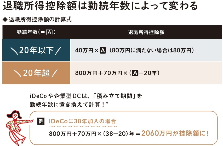 退職所得控除は勤続年数によって決まり、勤続20年までは1年につき40万円、その後は1年につき70万円が控除枠として増える仕組み。勤続38年の会社員が「一時金」で受け取った場合、2060万円までは税金がかかりません。iDeCoについては、勤続期間を加入期間にして計算。同じ年だけでなく過去に受け取った一時金も合算されるので注意しましょう。