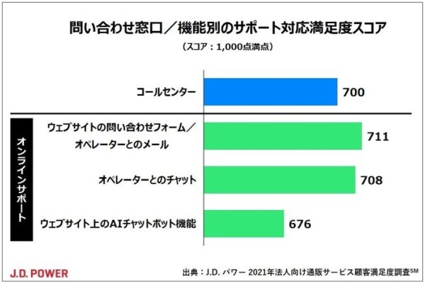 昨年の新型コロナウイルス感染拡大以降、コールセンターの運営は継続的な課題となっており、このようなオンラインサポートの活用促進は不可欠となっている。近年では多くの通販サービス事業者が、特にAIチャットによるサポート機能に注力しているが、本調査によれば、オンラインサポートのなかで「AIチャットボット」の満足度が最も低い結果となっている(下図参照)。