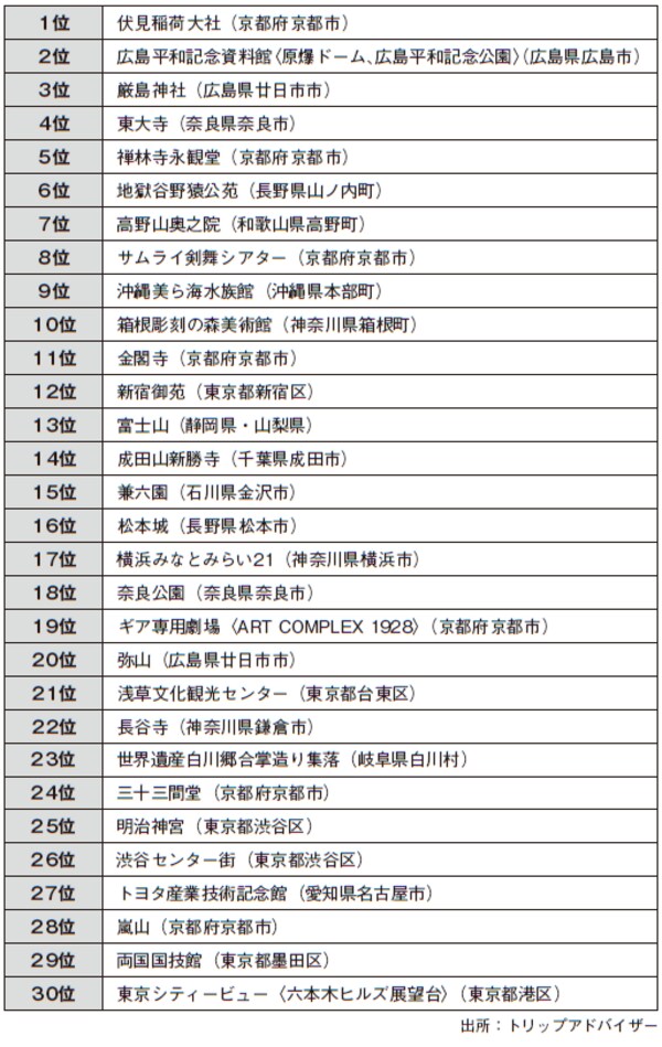 [図表]外国人に人気の観光スポットランキング ベスト30