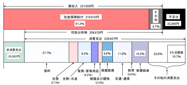 高齢夫婦無職世帯の家計収支の例 高齢者の夫婦無職世帯(夫65歳以上、妻60歳以上、世帯は2人きり)の家計収支は、次のようになっています。1カ月に必要な生活費は27万928円。このうち、年金が21万6910円で、その他の収入が2万749円です。 これだけでは、3万3269円が足りません。この不足分は、貯蓄からの取り崩しになります。