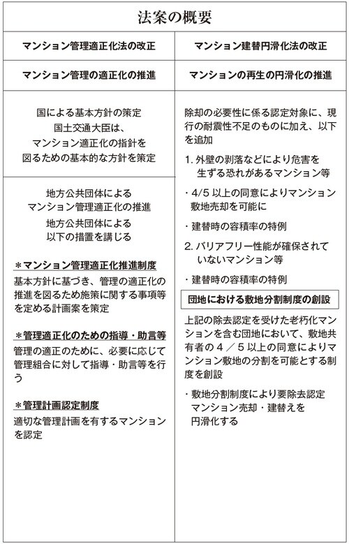 老朽化が進み、維持・修繕等が困難となったマンションの再生に向けた取組を強化すべく、令和2年2月28日に「マンション管理適正化法・マンション建替え円滑法」改正案が閣議決定され国会に提出されました。
